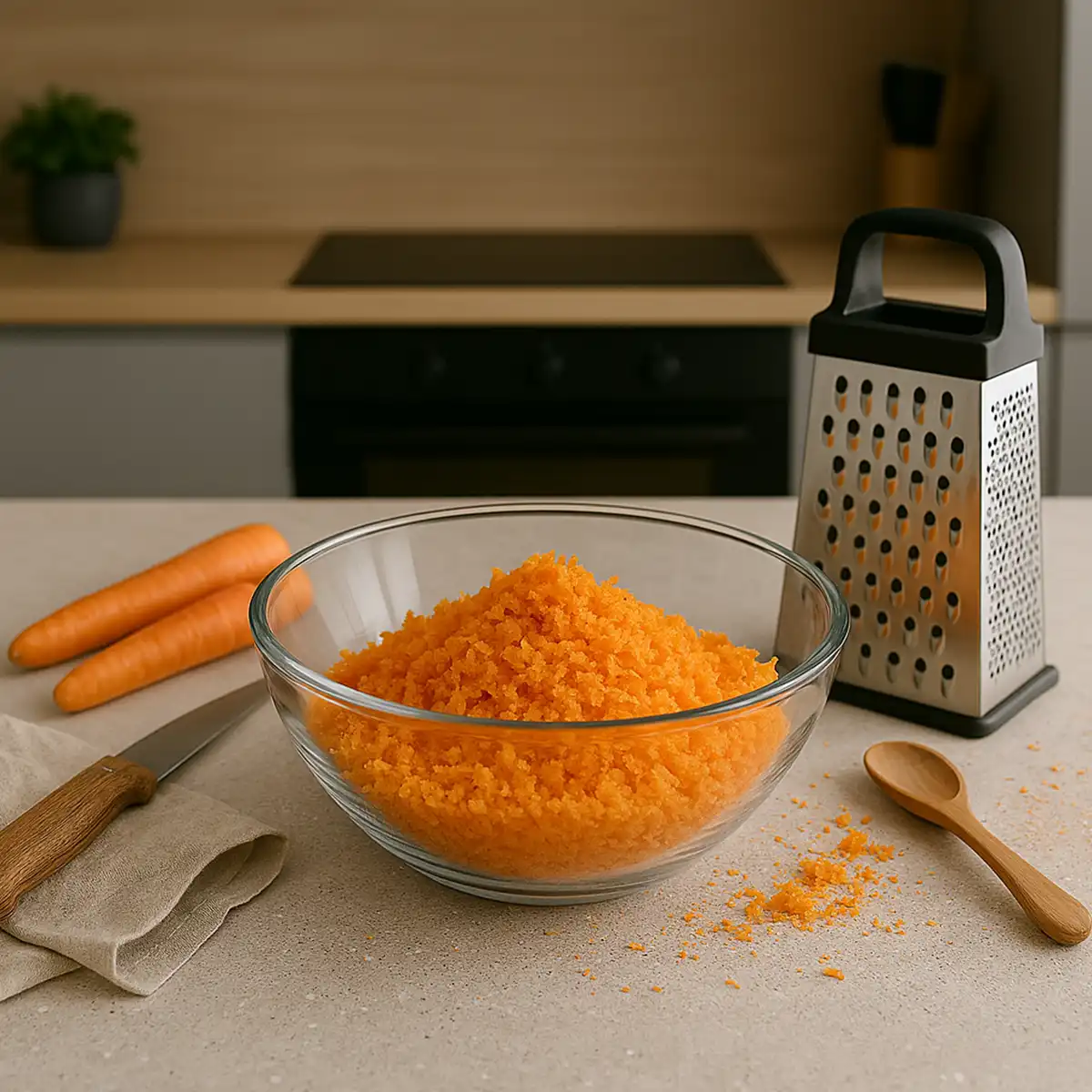 🟧 Iniziamo preparando l’ingrediente protagonista: le carote. Vanno sbucciate e lavate con cura, poi grattugiate finemente con una grattugia a maglie strette. Se preferiamo, possiamo usare un mixer, facendo però attenzione a non ridurle in poltiglia: l’ideale è ottenere una consistenza umida ma granulosa, che si amalgami bene all’impasto. Questo passaggio è fondamentale perché le carote, oltre a dare sapore, donano una morbidezza unica al plumcake.