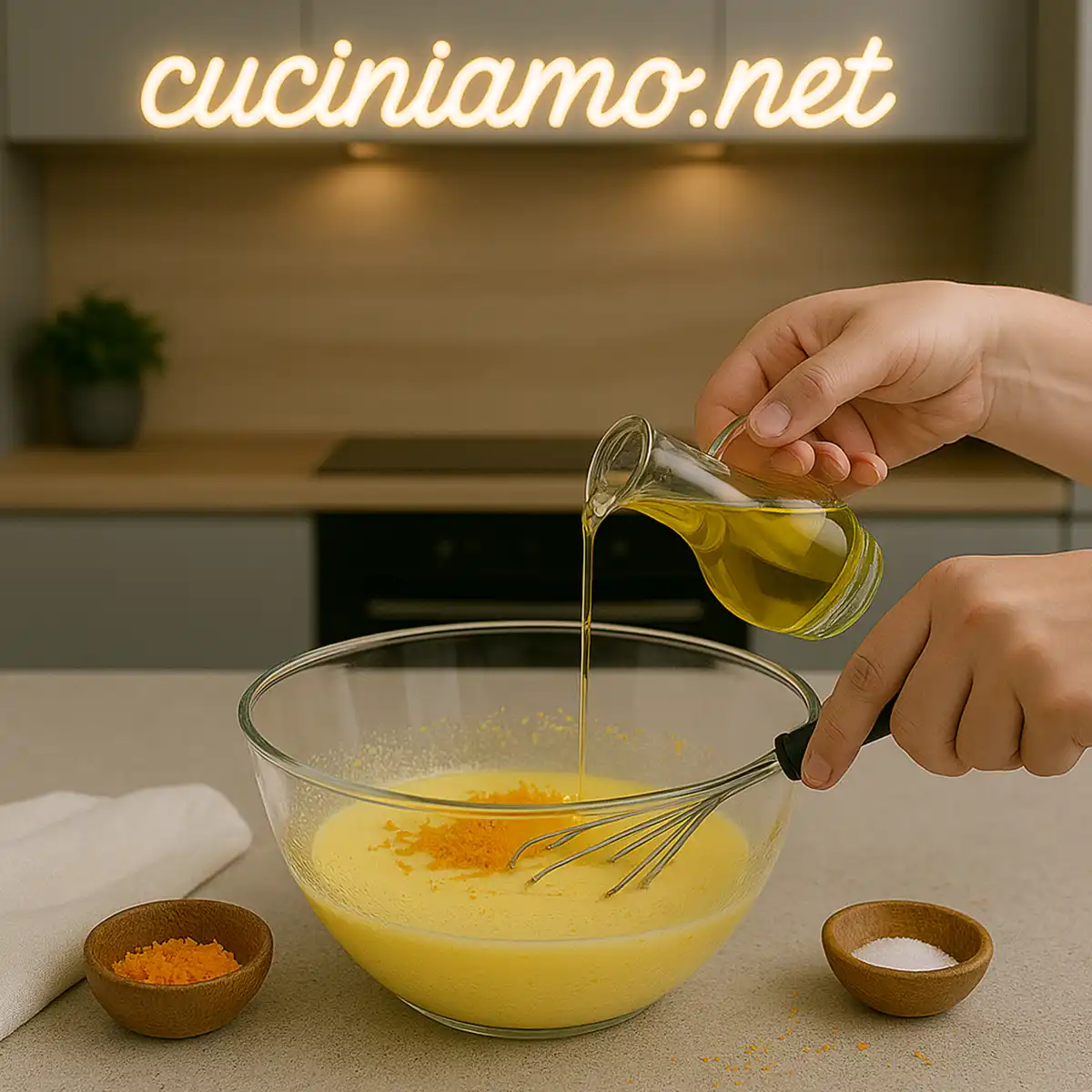 🟧 Una volta ottenuta una bella crema, versiamo l’olio a filo, mescolando delicatamente per non smontare le uova. Aggiungiamo anche la scorza grattugiata di un’arancia biologica, che darà un profumo fresco e leggermente agrumato, perfetto per bilanciare la dolcezza delle carote. A questo punto uniamo un pizzico di sale, che sembra un dettaglio ma fa davvero la differenza nel risultato finale.