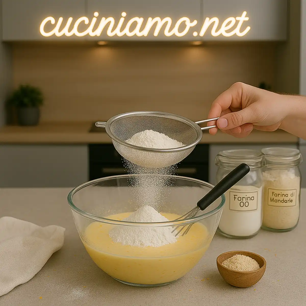 🟧 Ora tocca agli ingredienti secchi: setacciamo la farina 00 con il lievito direttamente nella ciotola, poi aggiungiamo anche la farina di mandorle. Se non l’abbiamo, possiamo tritare finemente delle mandorle pelate con un cucchiaio di zucchero: otterremo una polvere leggermente più grossolana ma dal gusto ancora più autentico e intenso.