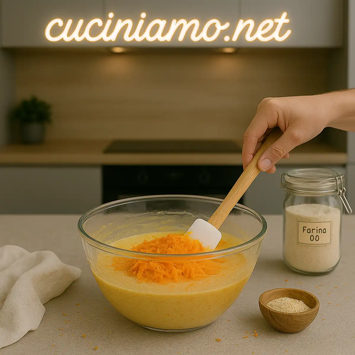 🟧 Con una spatola o un cucchiaio di legno, mescoliamo con movimenti delicati dal basso verso l’alto, giusto il tempo di amalgamare tutto senza smontare troppo il composto. Infine incorporiamo le carote grattugiate. A questo punto l’impasto sarà profumatissimo e di un bel colore aranciato, molto invitante.