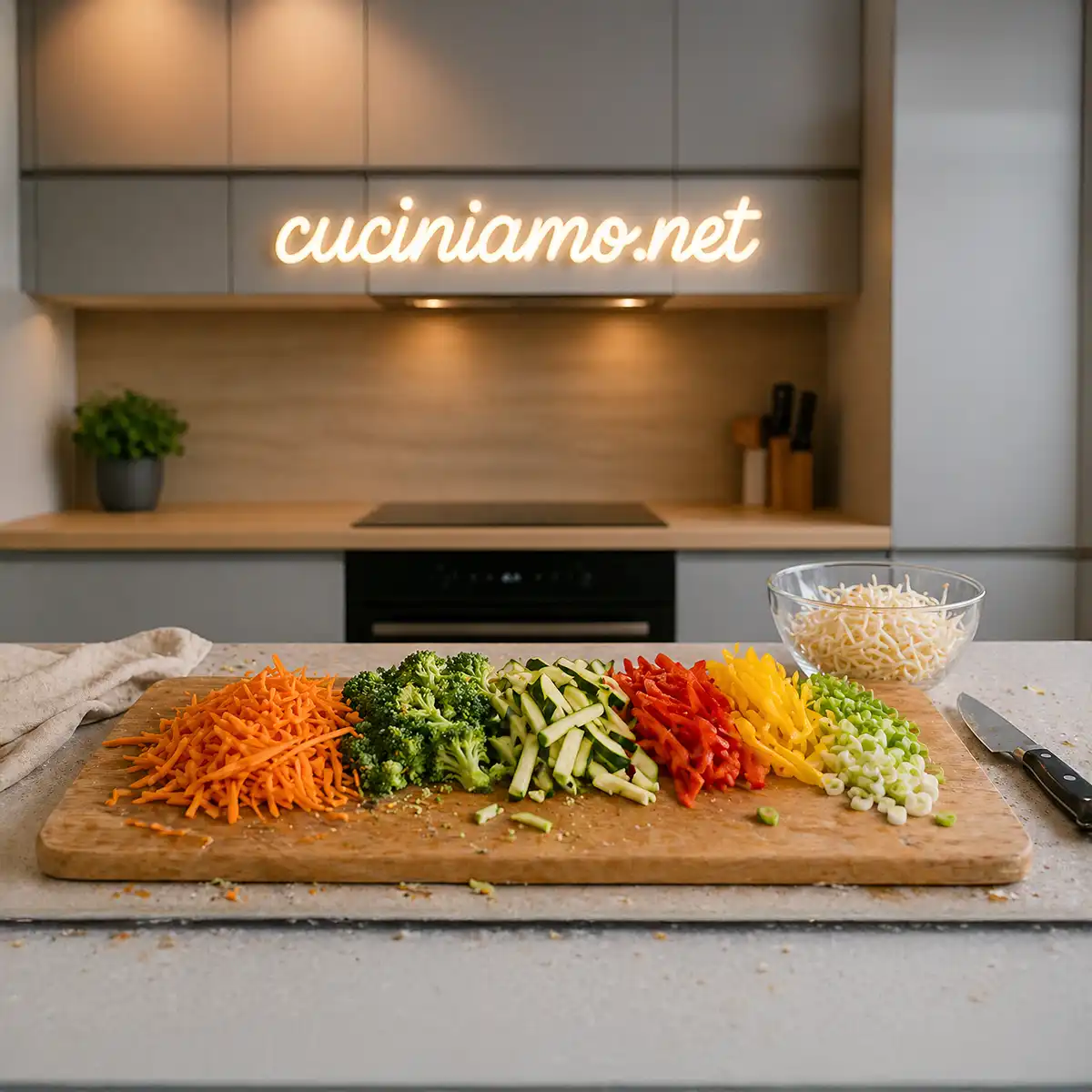 Tagliamo tutte le verdure a listarelle sottili e uniformi. L'uniformità del taglio non è un dettaglio estetico: pezzi di dimensioni diverse cuociono in modo irregolare, con il risultato che alcuni saranno ancora crudi mentre altri saranno già troppo morbidi. La carota, essendo la verdura più dura, va tagliata ancora più sottile rispetto alle altre, oppure a julienne. I broccoli si dividono in piccole cimette.