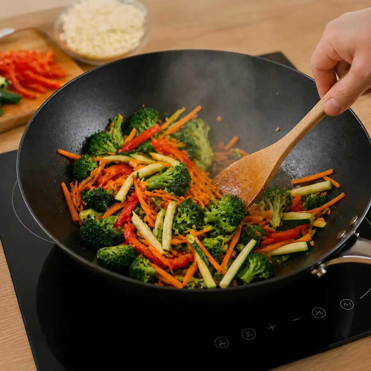 La cottura nel wok è rapida per definizione: bastano pochi minuti e non c'è tempo per fermarsi a tagliare o cercare ingredienti durante la cottura. È fondamentale organizzarsi prima, tenendo tutto pronto e a portata di mano. La logica da seguire è semplice: aromi prima per costruire la base profumata, poi le verdure più dure, poi quelle più delicate, fiamma sempre alta e mescolamento continuo. Solo così si ottengono verdure croccanti e saporite, non bollite.