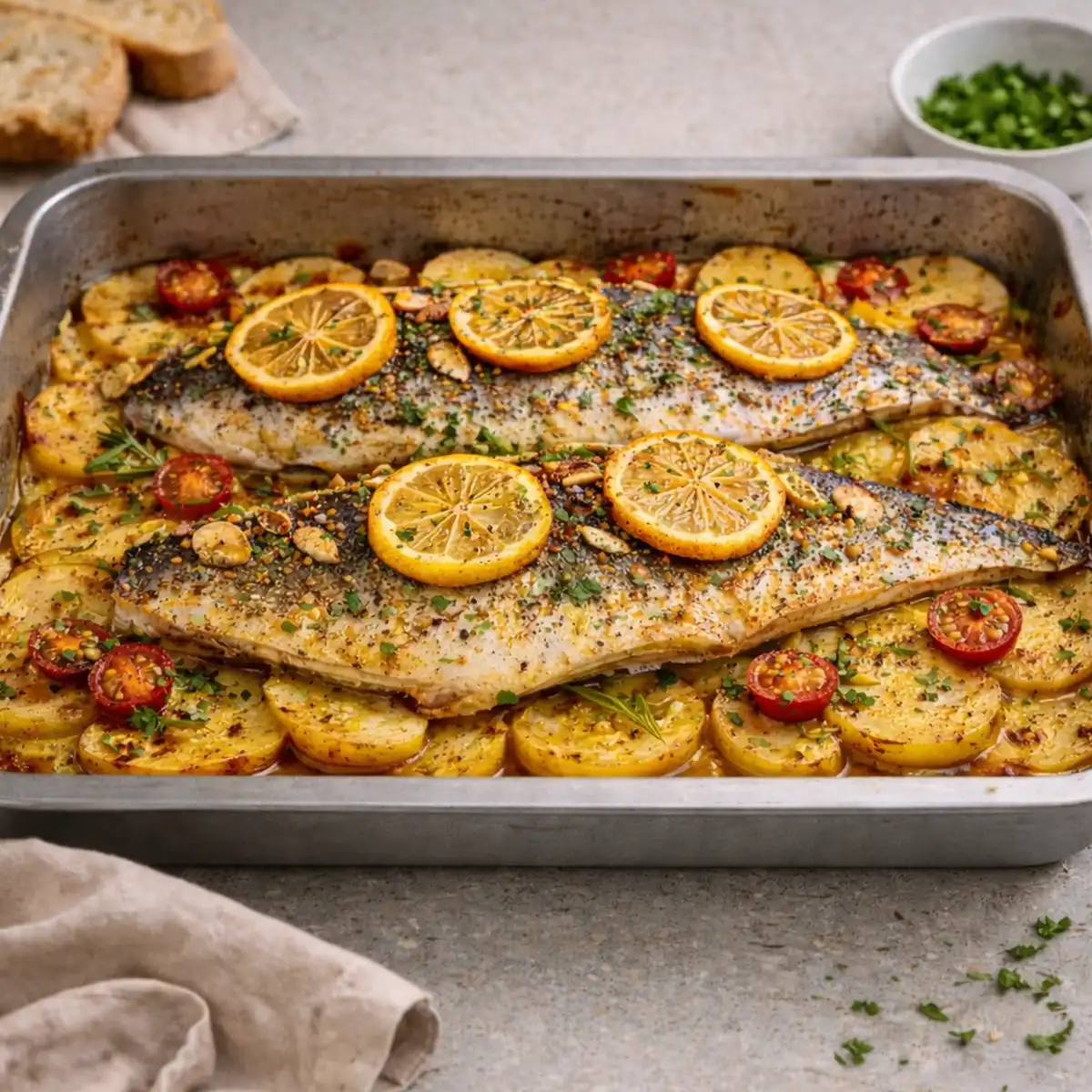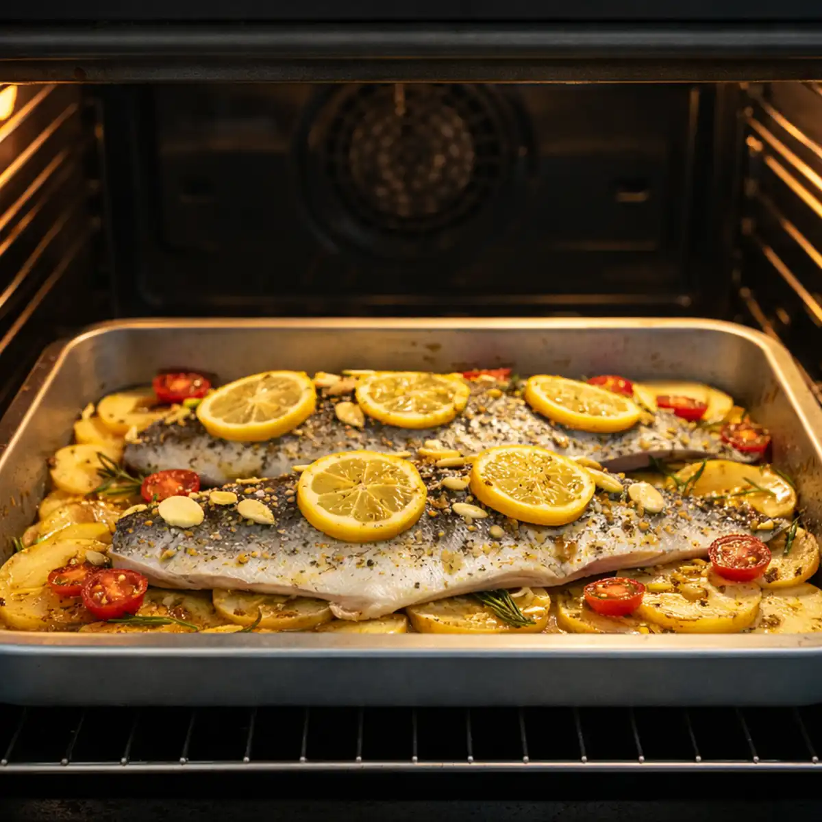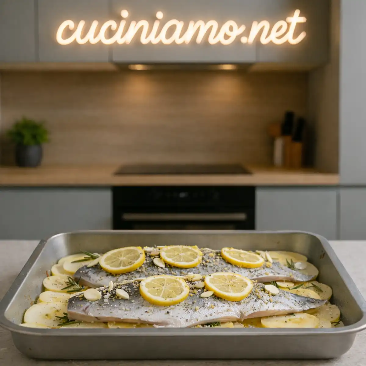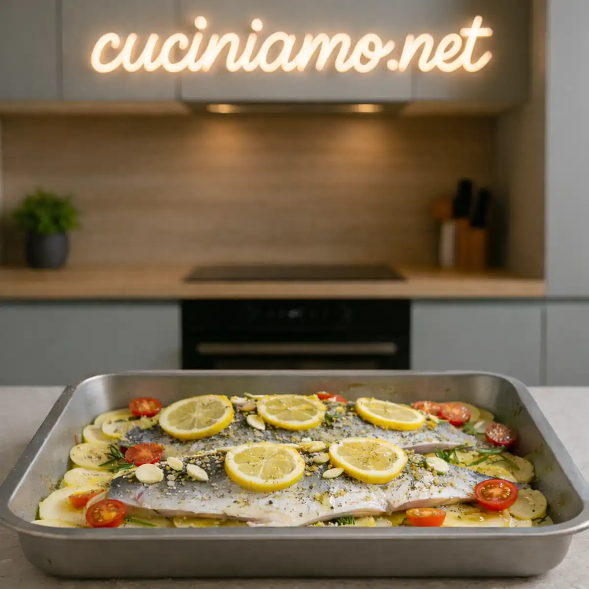 Inforniamo a 180°C in forno statico per circa 20-25 minuti. Il tempo può variare leggermente in base allo spessore dei filetti e alla potenza del forno. Il pesce sarà pronto quando si sfalda facilmente con la forchetta e le patate saranno morbide e dorate.