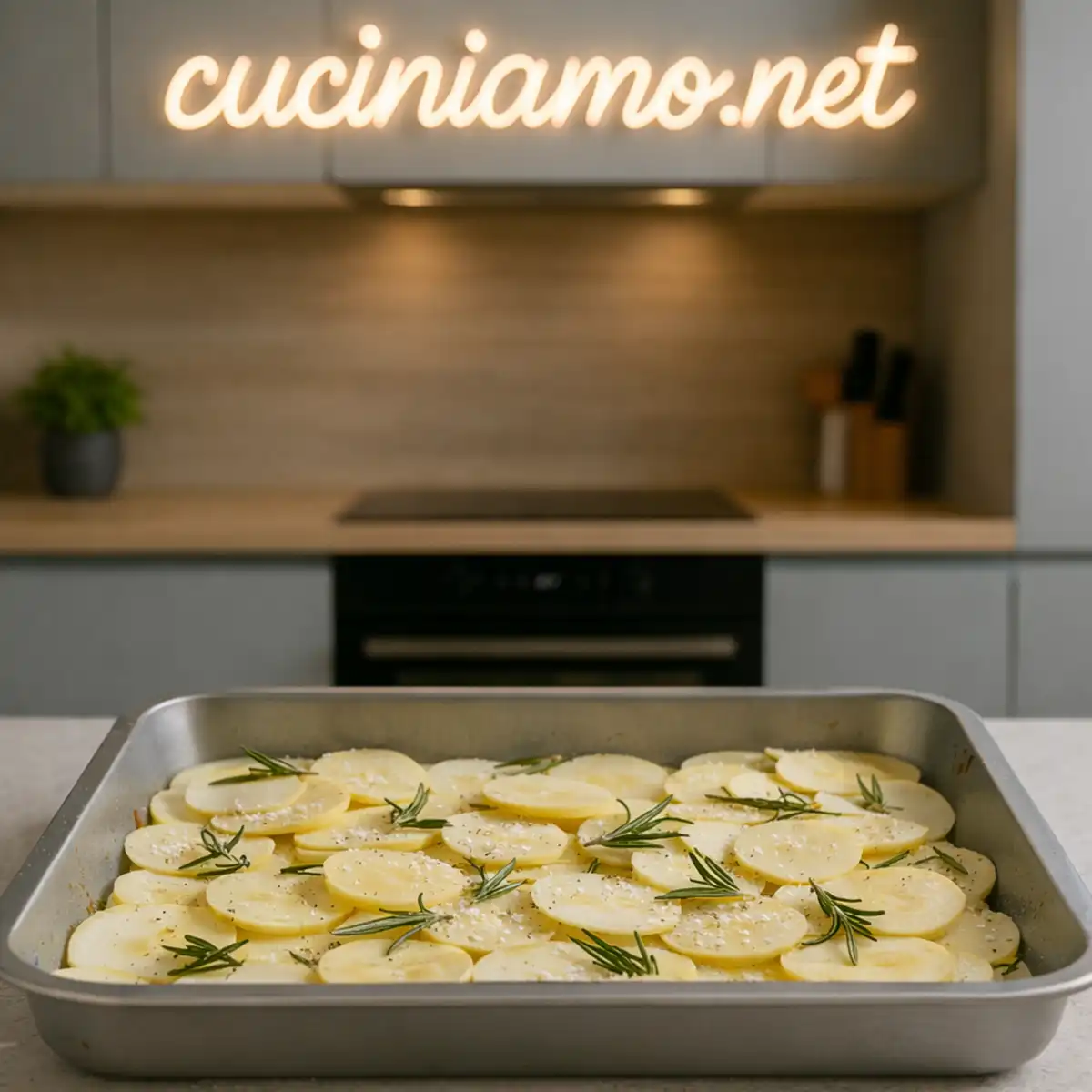 Come prima cosa, laviamo, peliamo le patate e le tagliamo a fettine sottili. Cerchiamo sempre di farle abbastanza uniformi, così cuociono in modo omogeneo. Le sistemiamo in una teglia leggermente unta con un filo d'olio, aggiungiamo un pizzico di sale e qualche rametto di rosmarino.